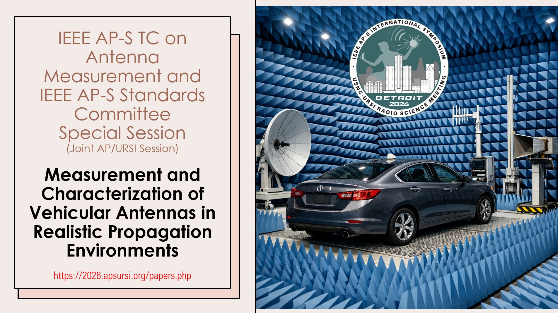 The IEEE AP-S Technical Committee on Antenna Measurement (TC7), together with the IEEE AP-S Standards Committee, invites TC7 members and the broader antenna and measurement community to a focused special session at the 2026 IEEE AP-S International Symposium & USNC-URSI Radio Science Meeting in Detroit. This joint AP/URSI session will examine practical and research advances in the measurement and characterization of vehicular antennas under realistic propagation conditions, including laboratory and field approaches that bridge controlled testing and onâ€'vehicle performance.